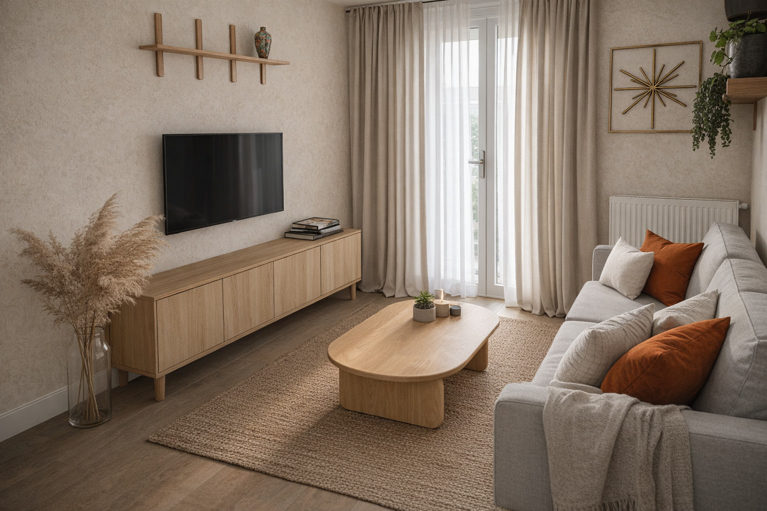 Une palette cohérente a été définie autour de tons neutres relevés par des touches de terracotta, qui viennent réchauffer subtilement l’ensemble et donner du caractère à l’espace. Enfin, pour répondre à la problématique d’encombrement, des solutions de rangement fermées ont été intégrées : un meuble TV discret et fonctionnel ainsi qu’un repose-pieds faisant office de coffre, permettant de désencombrer visuellement tout en optimisant l’espace. Le salon retrouve ainsi équilibre, chaleur et sérénité.