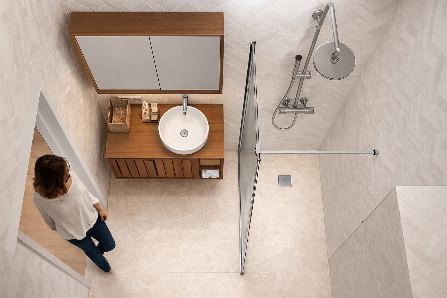Dans la salle de bains, le parti pris a été radical : tout a été déposé pour repartir sur des bases saines et cohérentes avec le reste du projet. L’ancienne cabine de douche d’angle, peu esthétique et peu fonctionnelle, a laissé place à une douche plus spacieuse et confortable, pensée comme un véritable espace de détente.