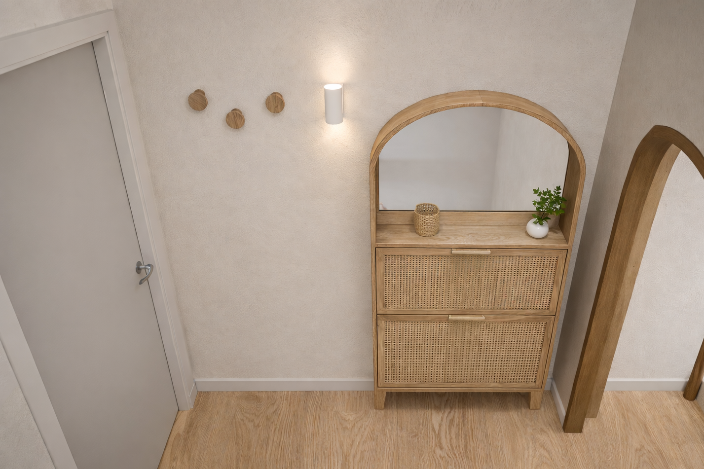 Un miroir vient compléter l’aménagement, apportant à la fois une touche esthétique et une vraie utilité, tout en agrandissant visuellement l’espace. Ici, tout repose sur l’essentiel : des choix justes, épurés, qui rendent l’entrée à la fois accueillante, organisée et agréable à vivre.