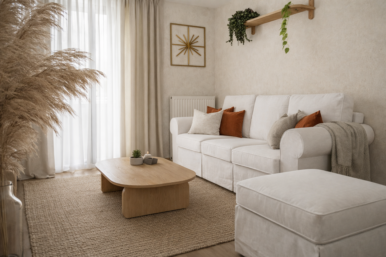 Dans le salon, l’intervention s’est concentrée sur une transformation à la fois esthétique et fonctionnelle. Les murs ont été entièrement repeints à la chaux dans une teinte blanc cassé, apportant douceur et luminosité tout en créant une base neutre et apaisante. Nous avons ensuite introduit des matériaux naturels et des textures enveloppantes — bois clair, textiles chaleureux, fibres tressées — afin de renforcer cette atmosphère cocooning recherchée.