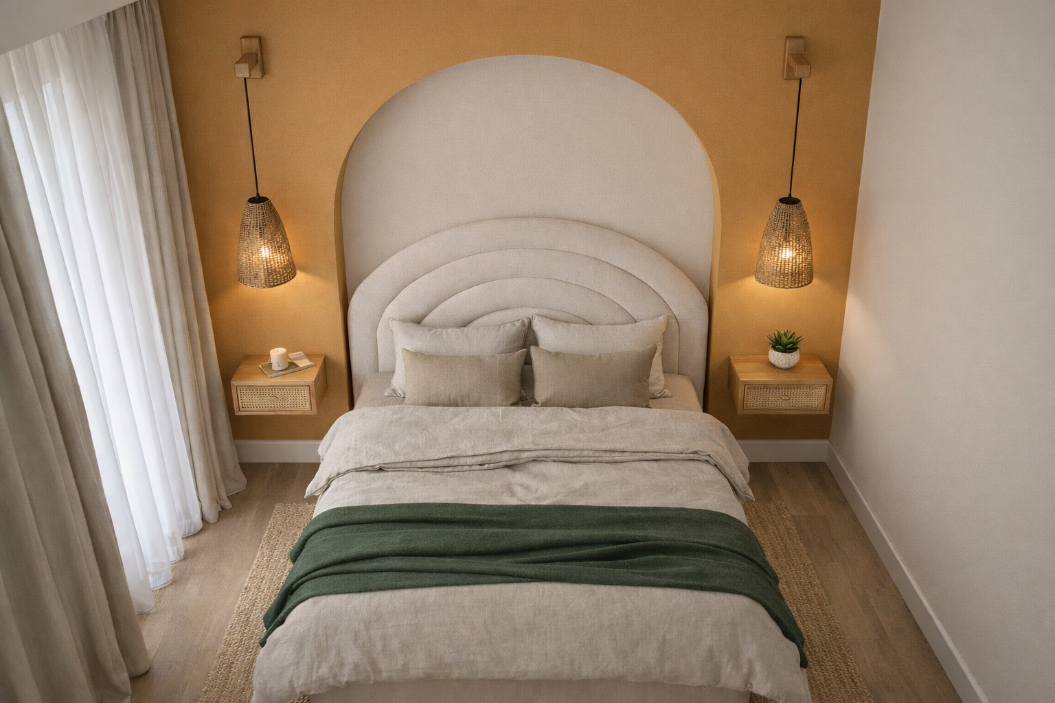 La teinte jaune chaude utilisée en fond vient envelopper la pièce et créer une ambiance douce et lumineuse, idéale pour un espace de repos. Elle est subtilement dynamisée par des touches de vert, qui insufflent du mouvement et apportent une note de fraîcheur à l’ensemble.