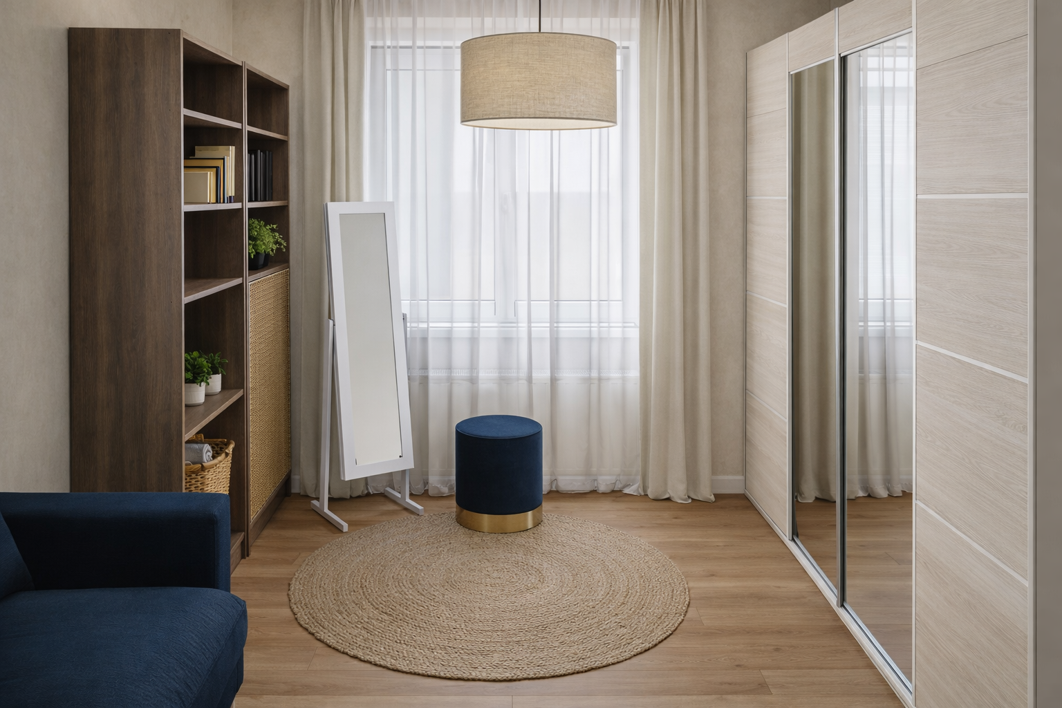 L’aménagement a été conçu pour allier praticité et confort, avec des rangements adaptés, un espace pour les bijoux et un coin permettant de se regarder et de composer ses tenues en toute sérénité. Un canapé convertible a été intégré afin de conserver une fonction d’accueil ponctuelle, sans compromettre l’usage principal de la pièce.